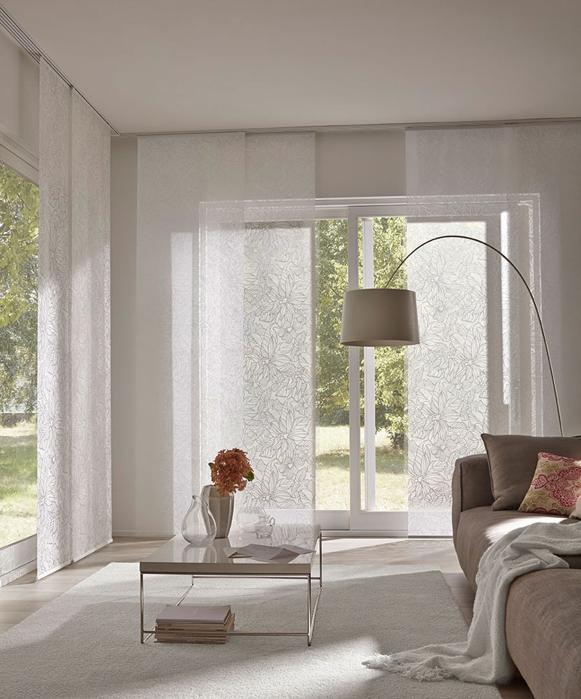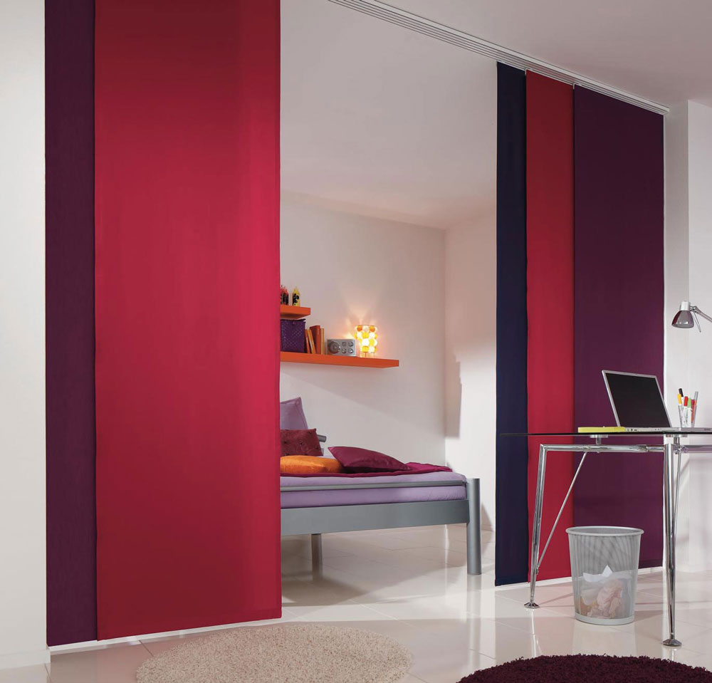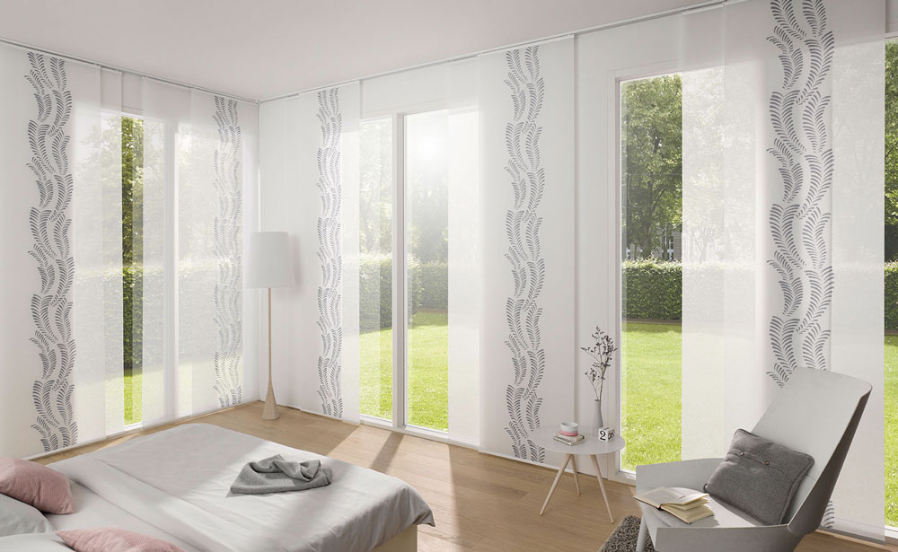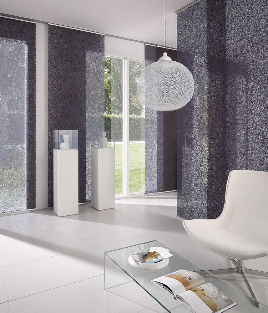 Stoffbahnen und Holzgewebe in verschiedenen Breiten werden anhand einer oberen Führungsschiene schnell hintereinander verschoben. Diese Lösung eignet sich zur Abgrenzung großer Fensterflächen. Durch ein reichhaltiges Sortiment können nahezu alle Farben gestalterisch aufgegriffen werden.